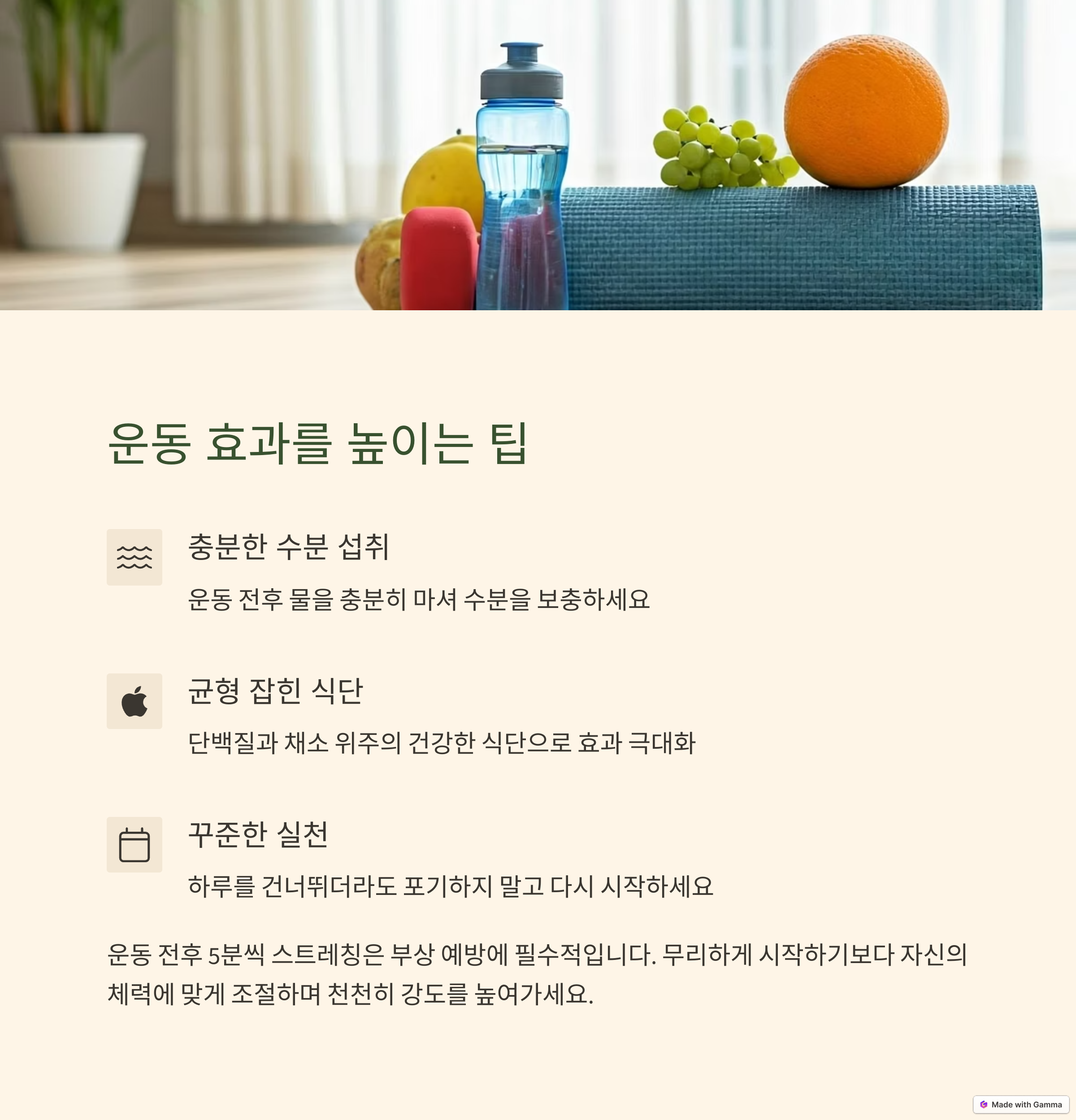 운동을 더 효과적으로 하기 위해선, 매일 같은 시간에 루틴을 수행하고 스트레칭과 함께 마무리하는 습관이 중요합니다. 운동 전후로 충분한 수분 섭취도 필수이며, 식단과 함께 병행하면 더욱 큰 시너지 효과를 기대할 수 있습니다. 무엇보다 중요한 것은 꾸준함입니다. 짧더라도 매일 지속하는 것이 장기적으로 큰 변화를 만들어냅니다.