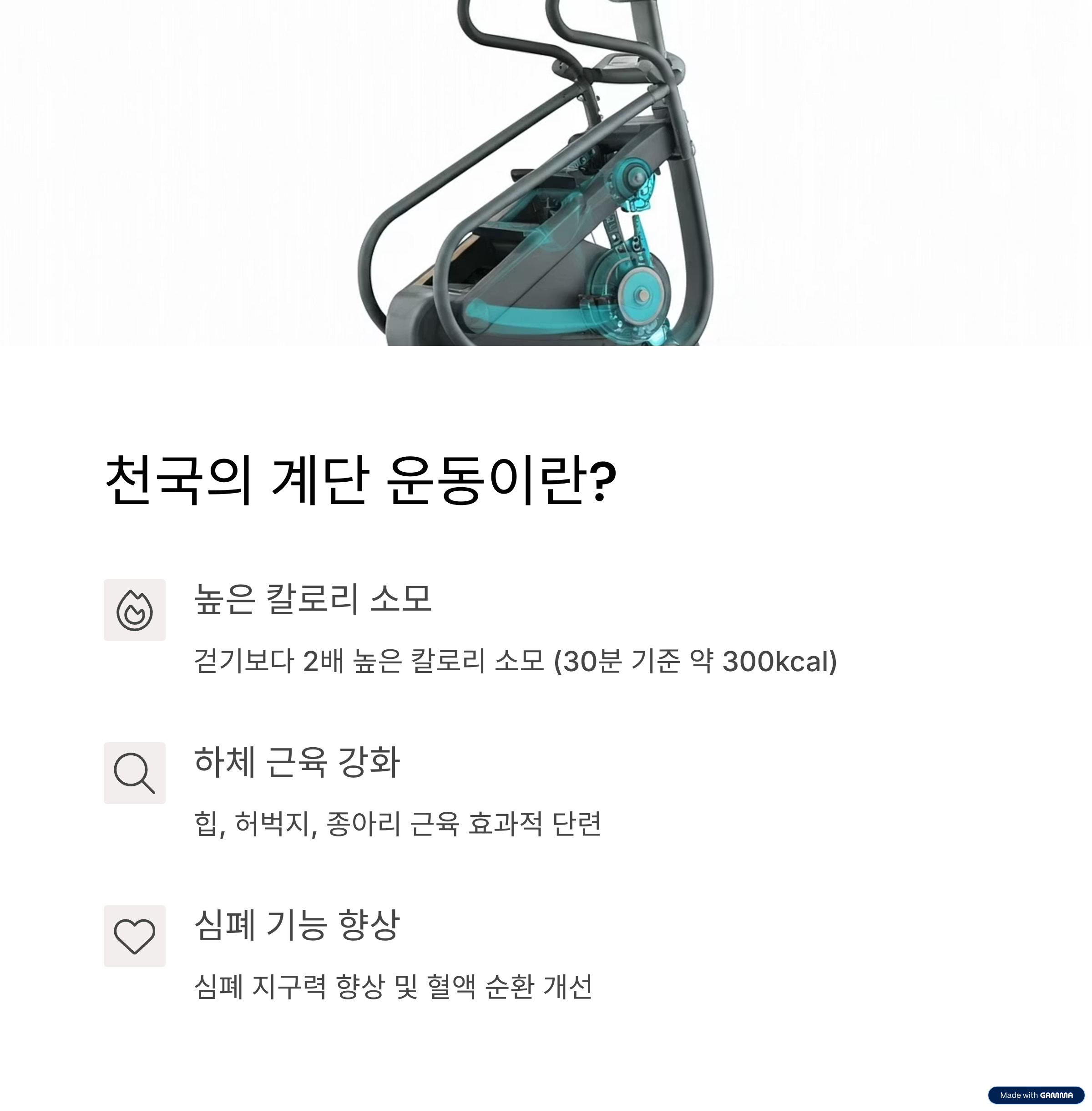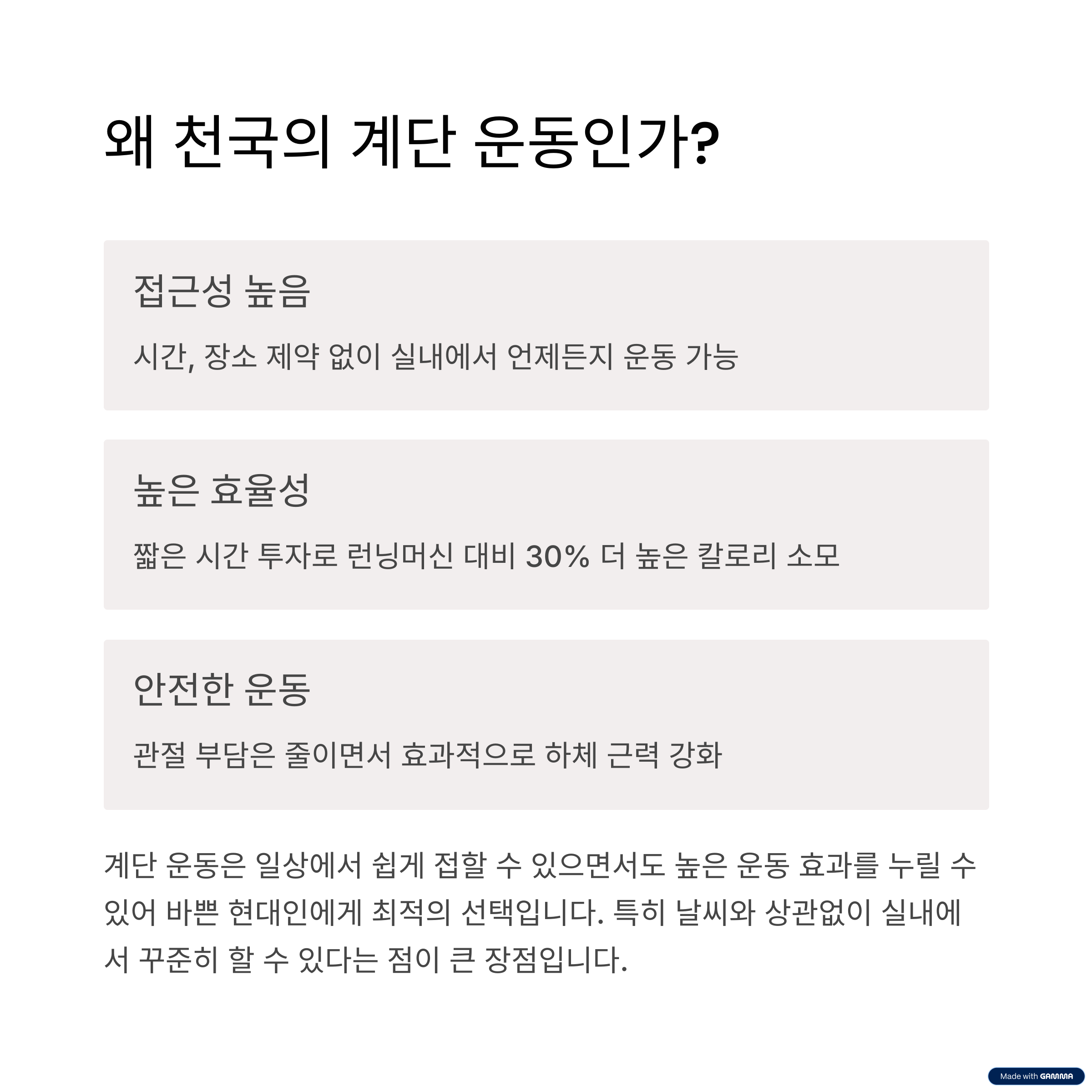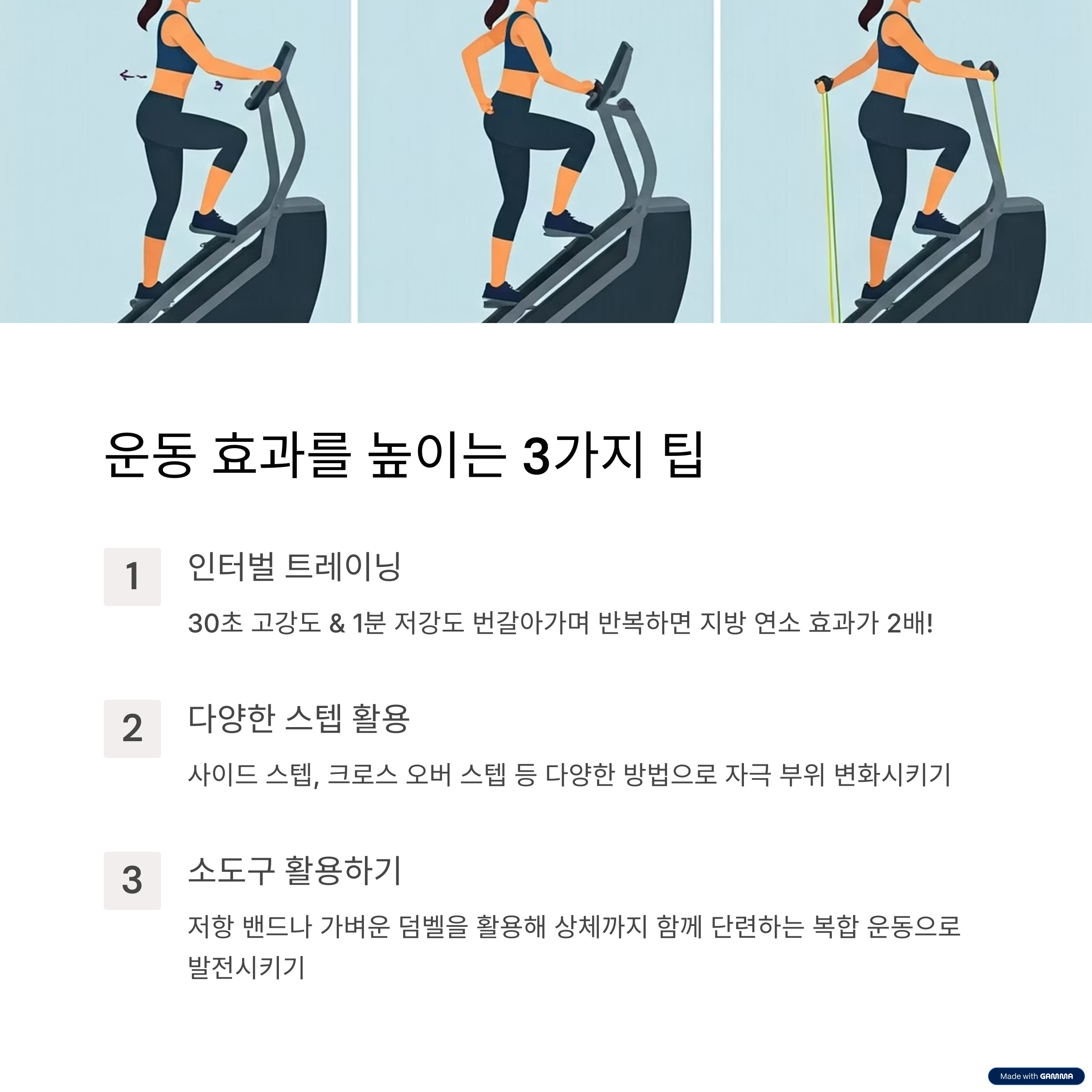 | 천국의 계단 | 약 300~500kcal | 전신 활용, 하체 집중 |