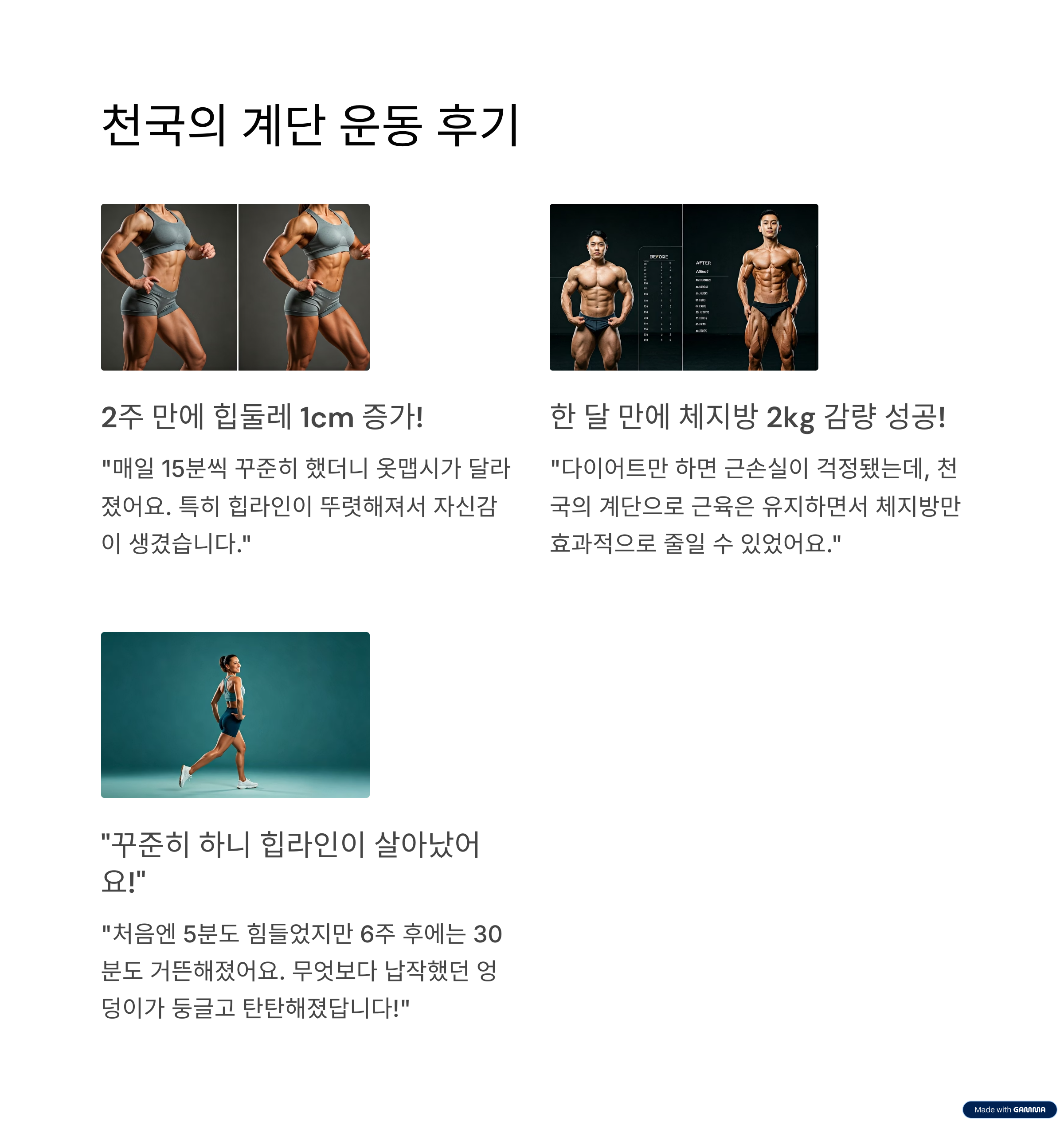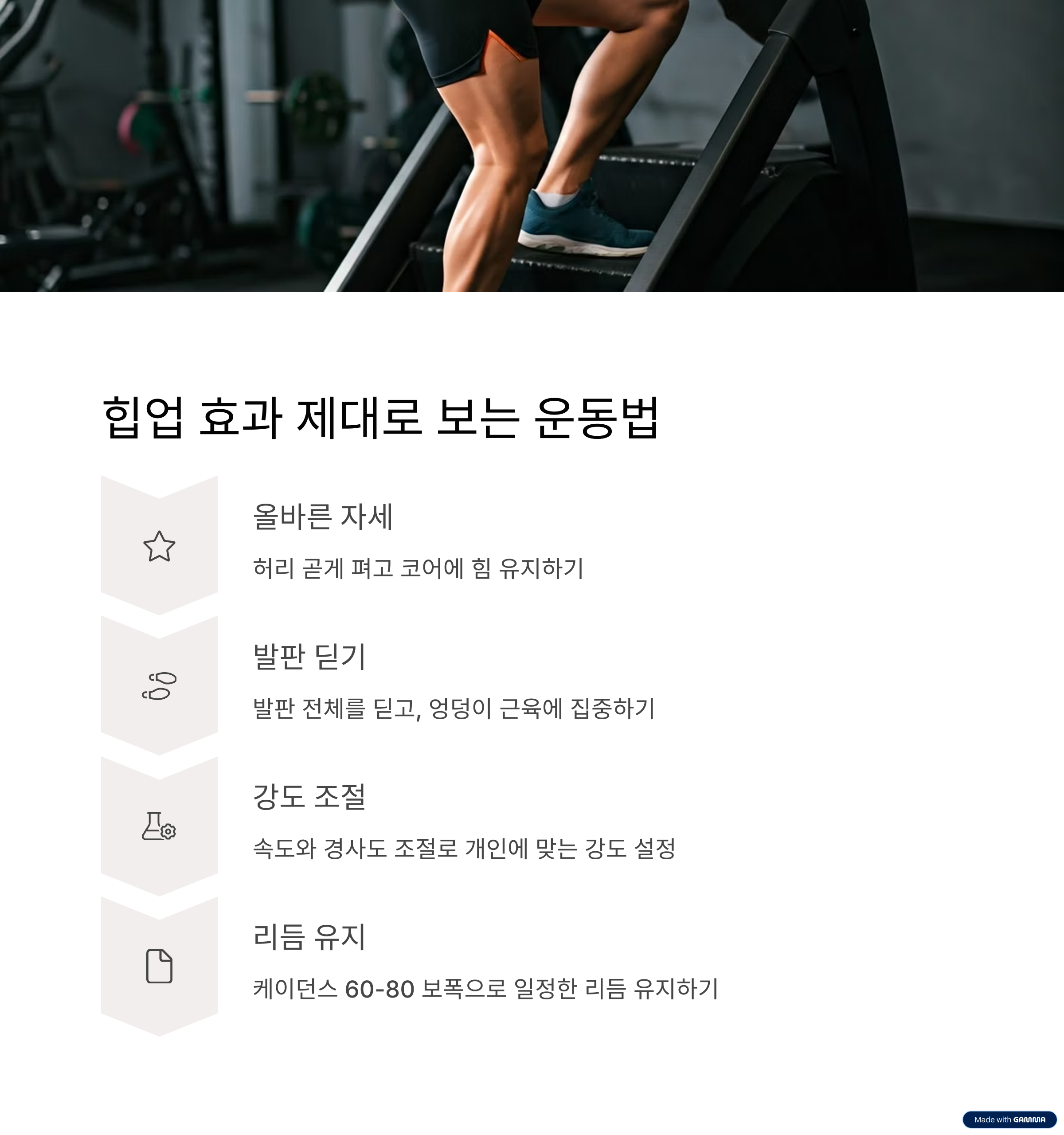 천국의 계단 운동은 둔근(엉덩이 근육)을 반복적으로 수축하고 이완시키는 동작으로 구성되어 있습니다. 발을 계단에 디딜 때, 몸을 위로 끌어올리는 과정에서 엉덩이 근육이 자연스럽게 활성화됩니다. 특히 발을 깊게 딛고 천천히 밀어올리는 동작은 일반적인 유산소 운동에서는 얻기 어려운 힙업 자극을 제공합니다. 꾸준히 운동을 이어가면 엉덩이 라인이 올라가고 단단해지는 것을 눈으로 확인할 수 있어요.