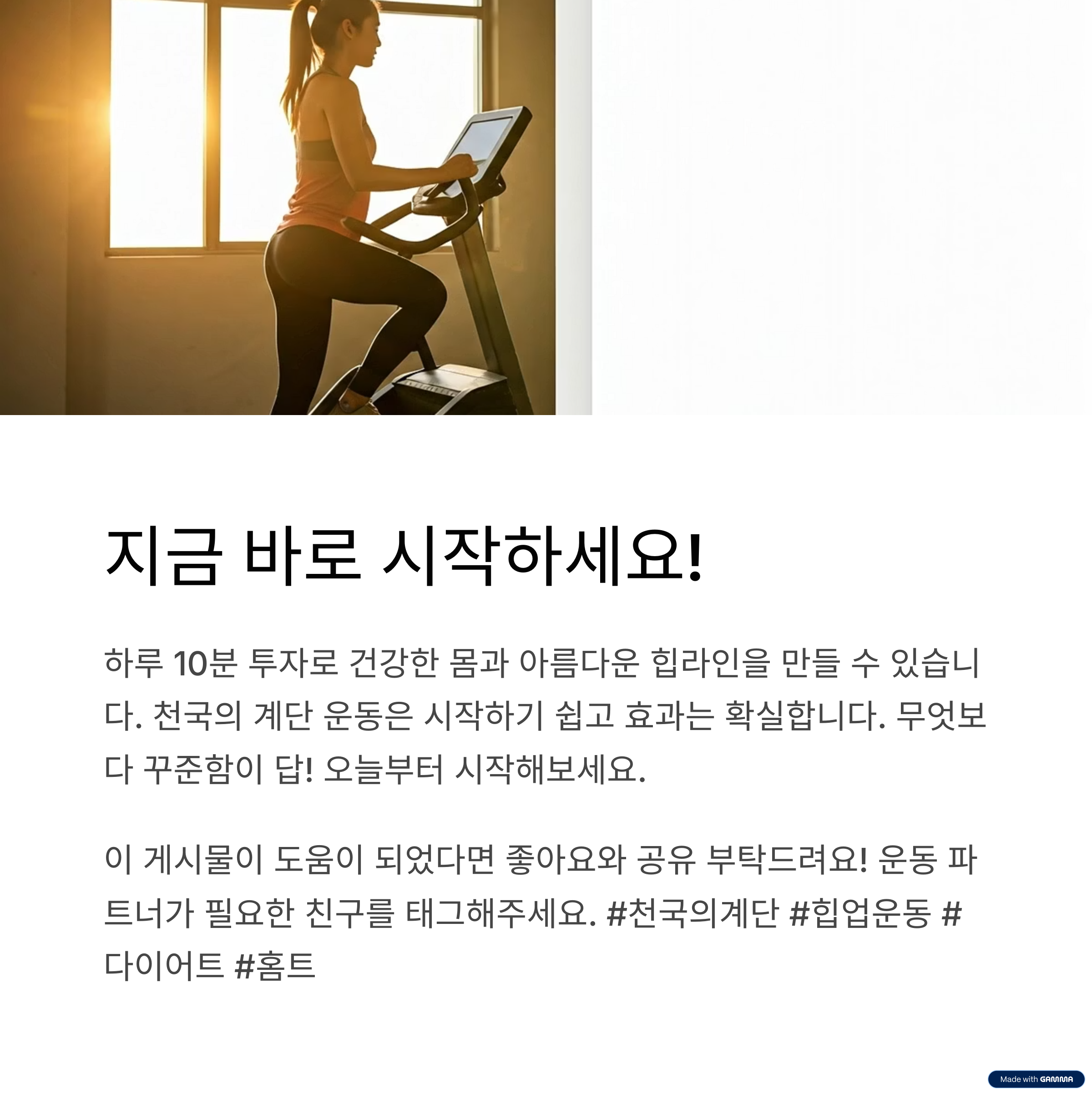 천국의 계단 운동은 바쁜 일상 속에서도 체중 감량과 힙업 효과를 동시에 누리고 싶은 분들에게 최적의 선택입니다. 계단을 오르는 자연스러운 동작을 반복하면서 하체 전체를 강화할 수 있으며, 특히 둔근을 효과적으로 단련시켜 탄탄한 힙라인을 만들어줍니다. 정해진 루틴 없이도 속도와 시간 조절로 충분히 변화를 줄 수 있고, 실내에서 날씨에 구애받지 않고 꾸준히 실천할 수 있다는 점이 큰 장점입니다. 운동 초보자라면 하루 10분씩부터 천천히 시작해보세요. 꾸준함이 곧 결과입니다.