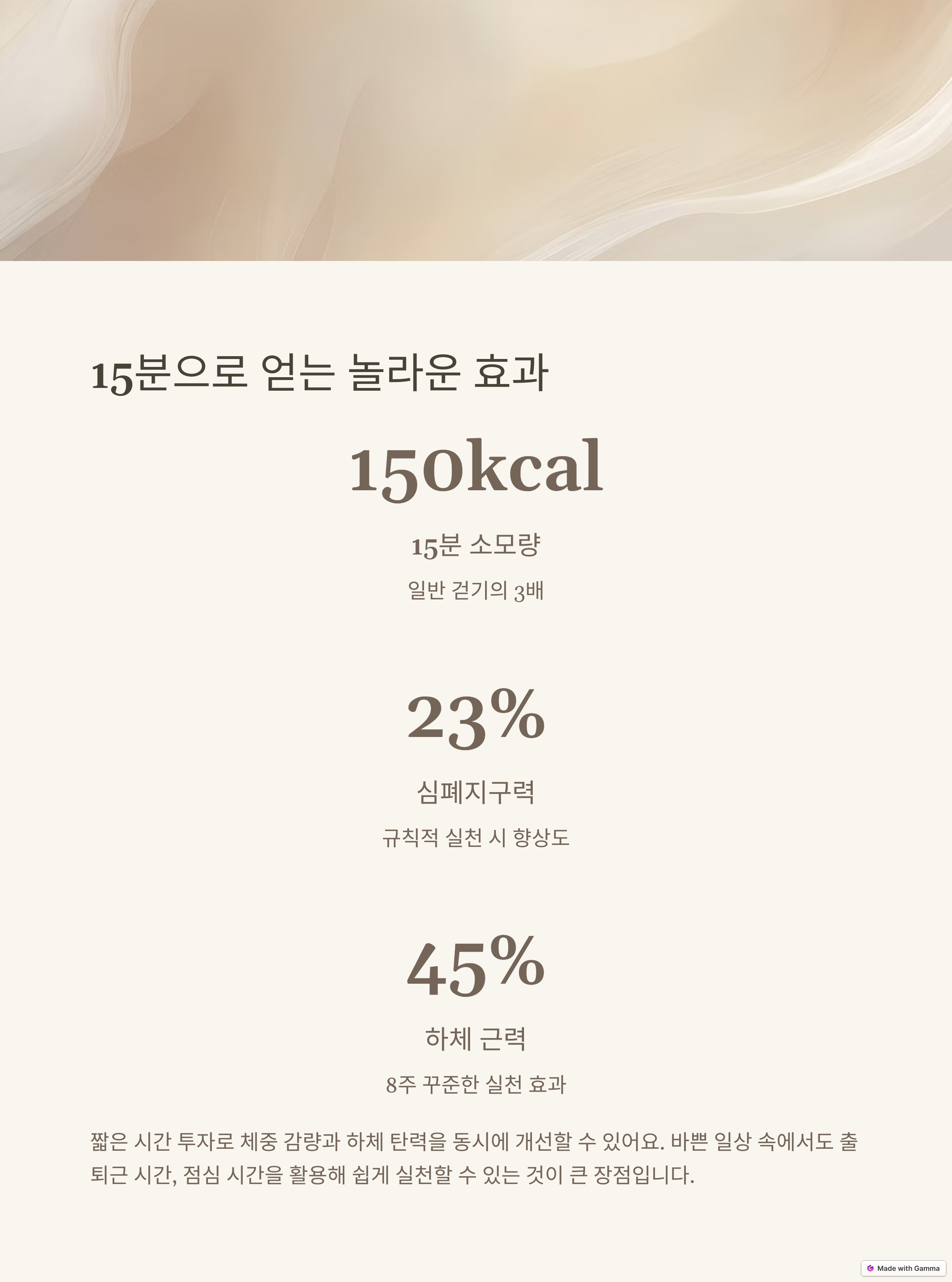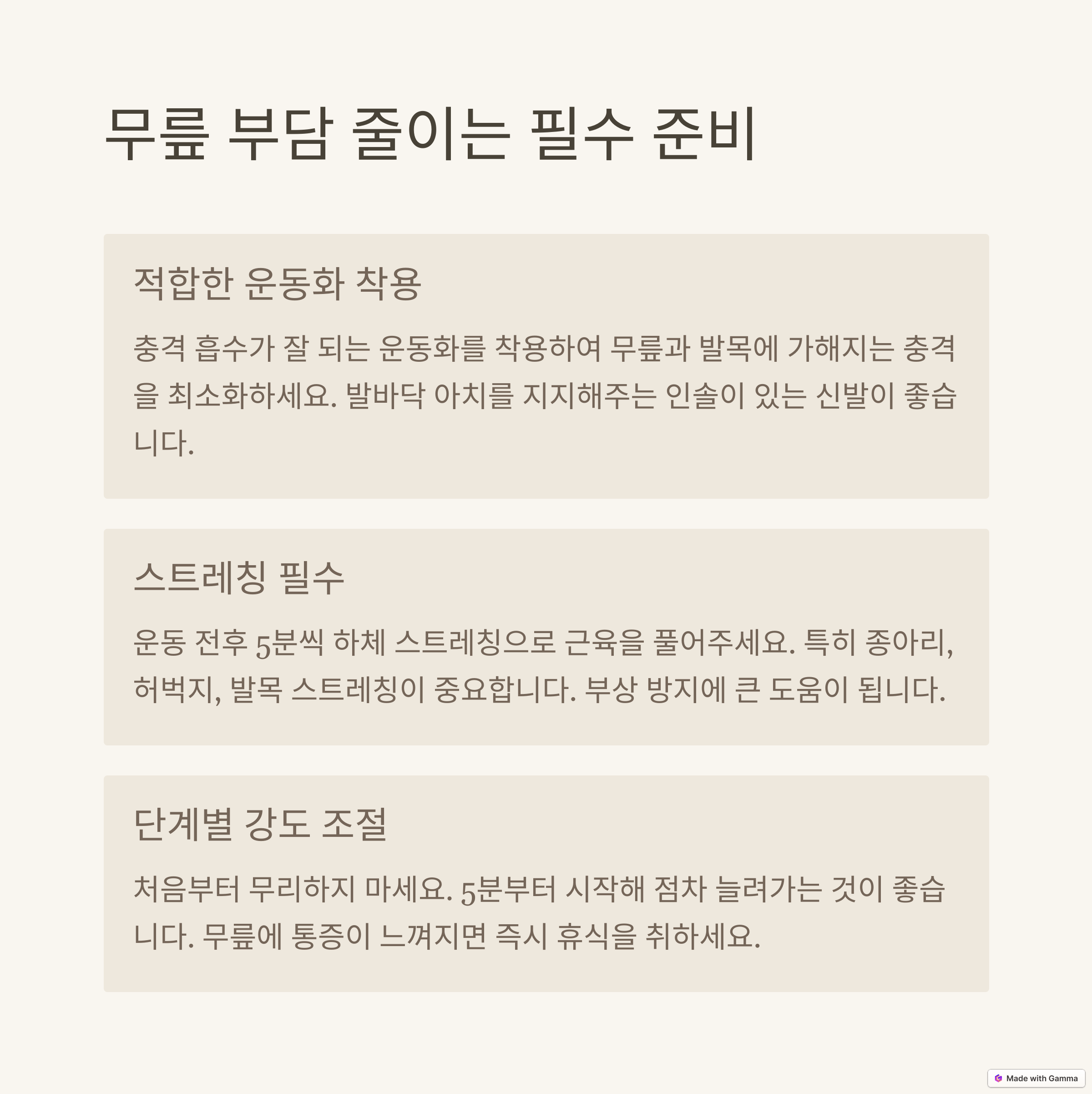 | 점심 후, 아침 출근 전 등 짧은 시간 활용 | 숨이 찰 정도의 속도 유지 | 무릎 통증 시 중단하고 자세 점검 |