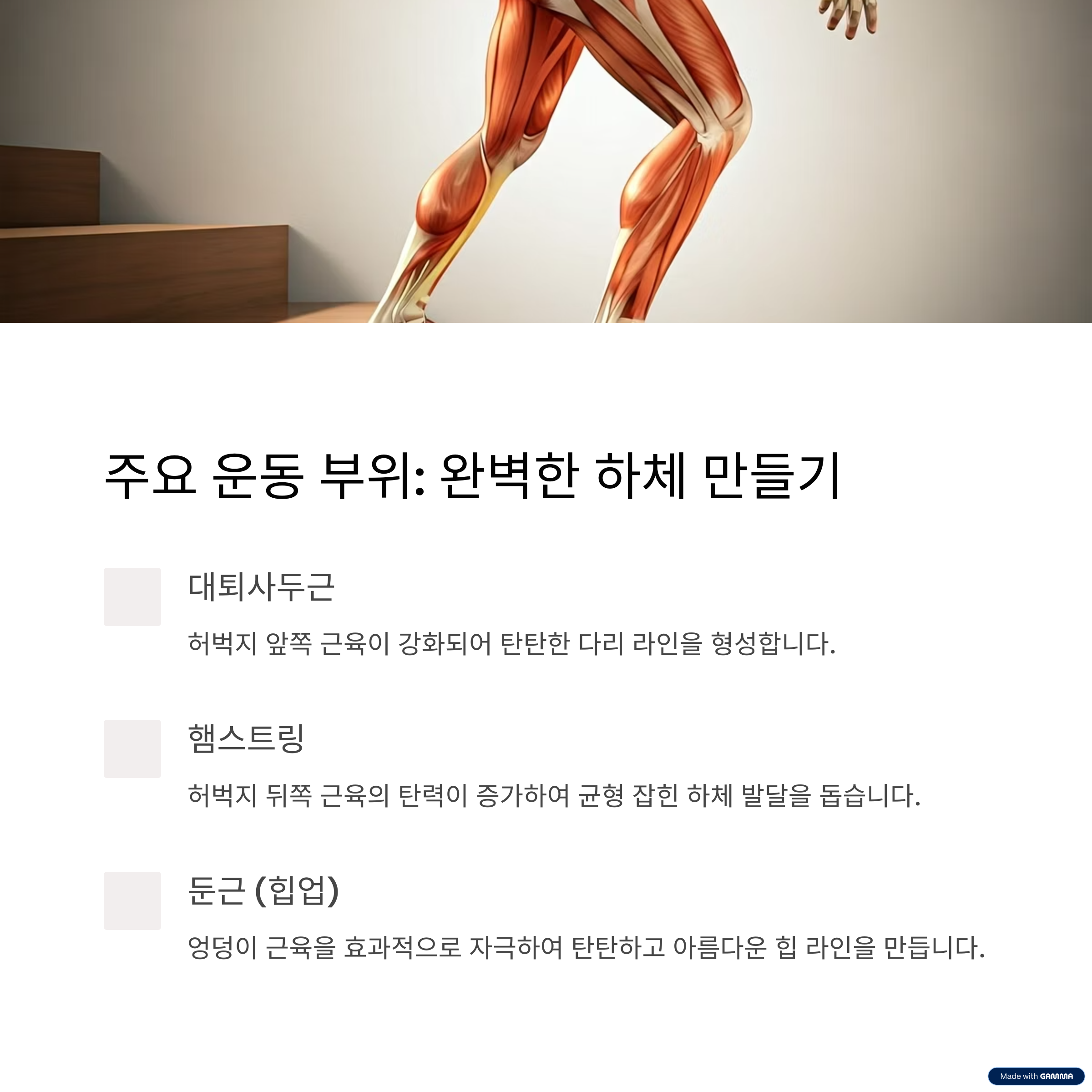 | 둔근 | 엉덩이 근육 강화 | 체형 개선 효과 |