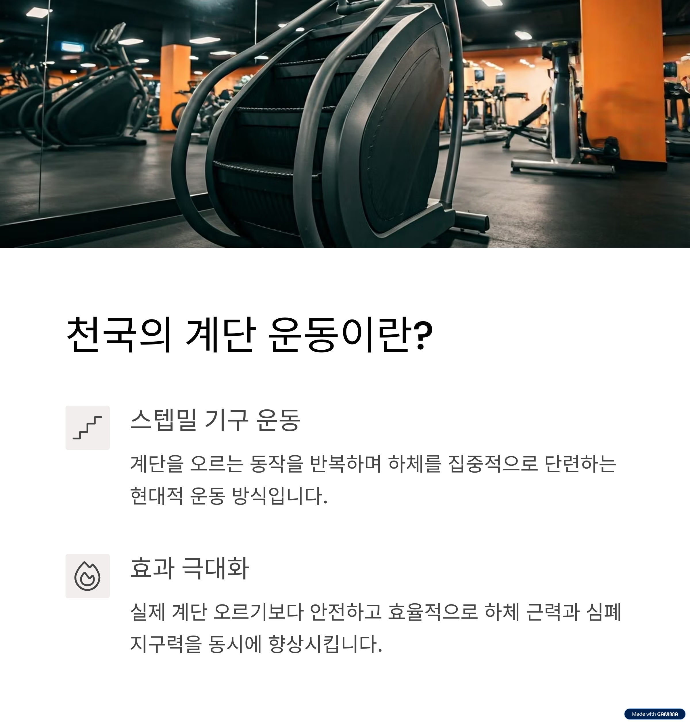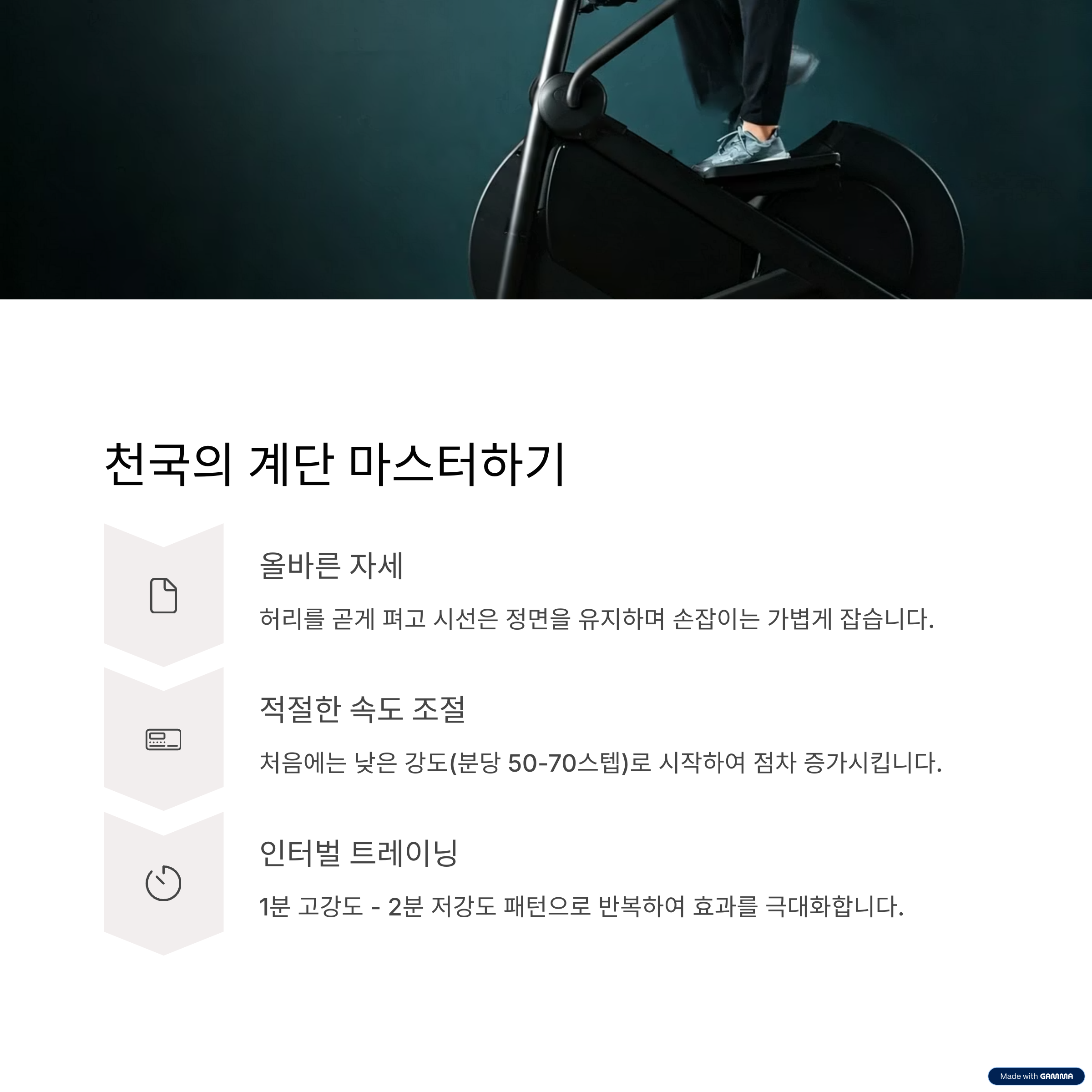 계단을 오르는 단순한 반복 속에 숨겨진 고강도 하체 운동! 유산소와 근력 강화, 두 마리 토끼를 잡는 기구입니다.